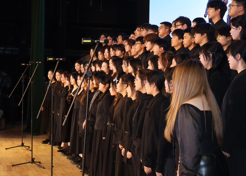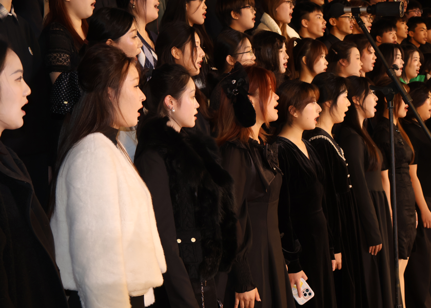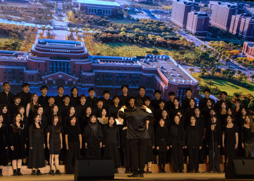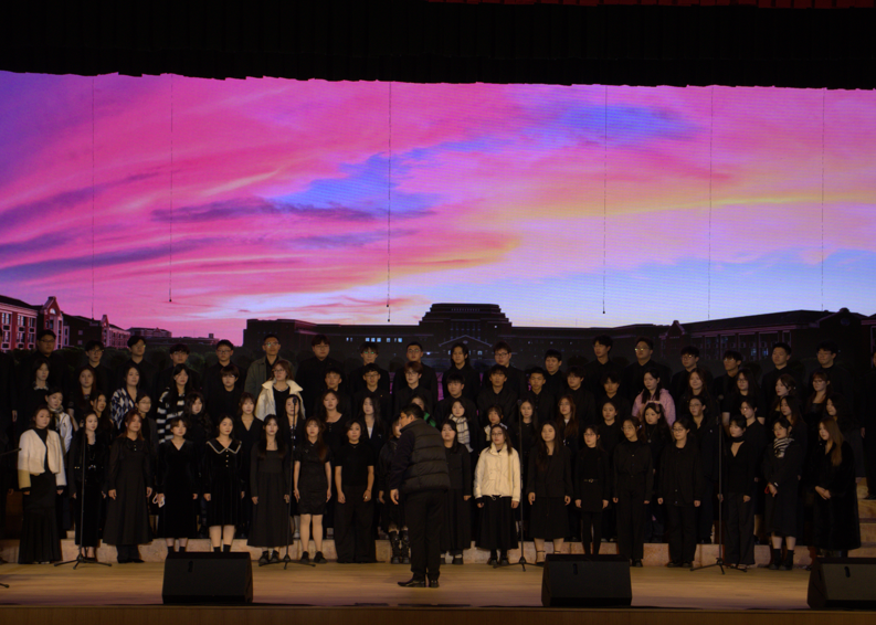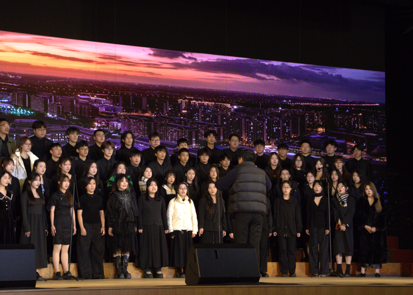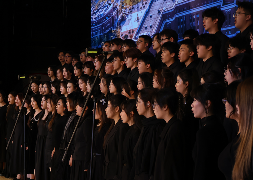 本场音乐会以“心声回响,乡土情长”、“万物生息,同心共鸣”、“家国画卷,追梦前行”三大篇章徐徐展开、层层推进。我校合唱团80位团员在第二篇章“万物生息,同心共鸣”中压轴登场,以精湛的技艺和饱满的热情,展现了建桥学子的艺术风采与昂扬精神,并与其他15所高校学子共同构筑了一场展现当代大学生艺术素养与精神风貌的音乐盛宴。