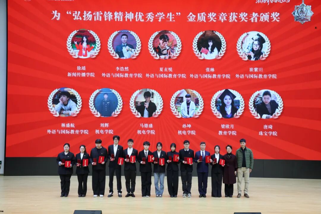 大会现场颁发了2025年度雷锋金、银、铜质奖章。校领导和优秀校友代表共同为“教职工雷锋奖”获得者、“弘扬雷锋精神优秀学生” 金质、银质、铜质奖章获奖代表,“弘扬雷锋精神优秀班级”获奖代表颁奖,并为“优秀雷锋志愿者服务队”授旗。